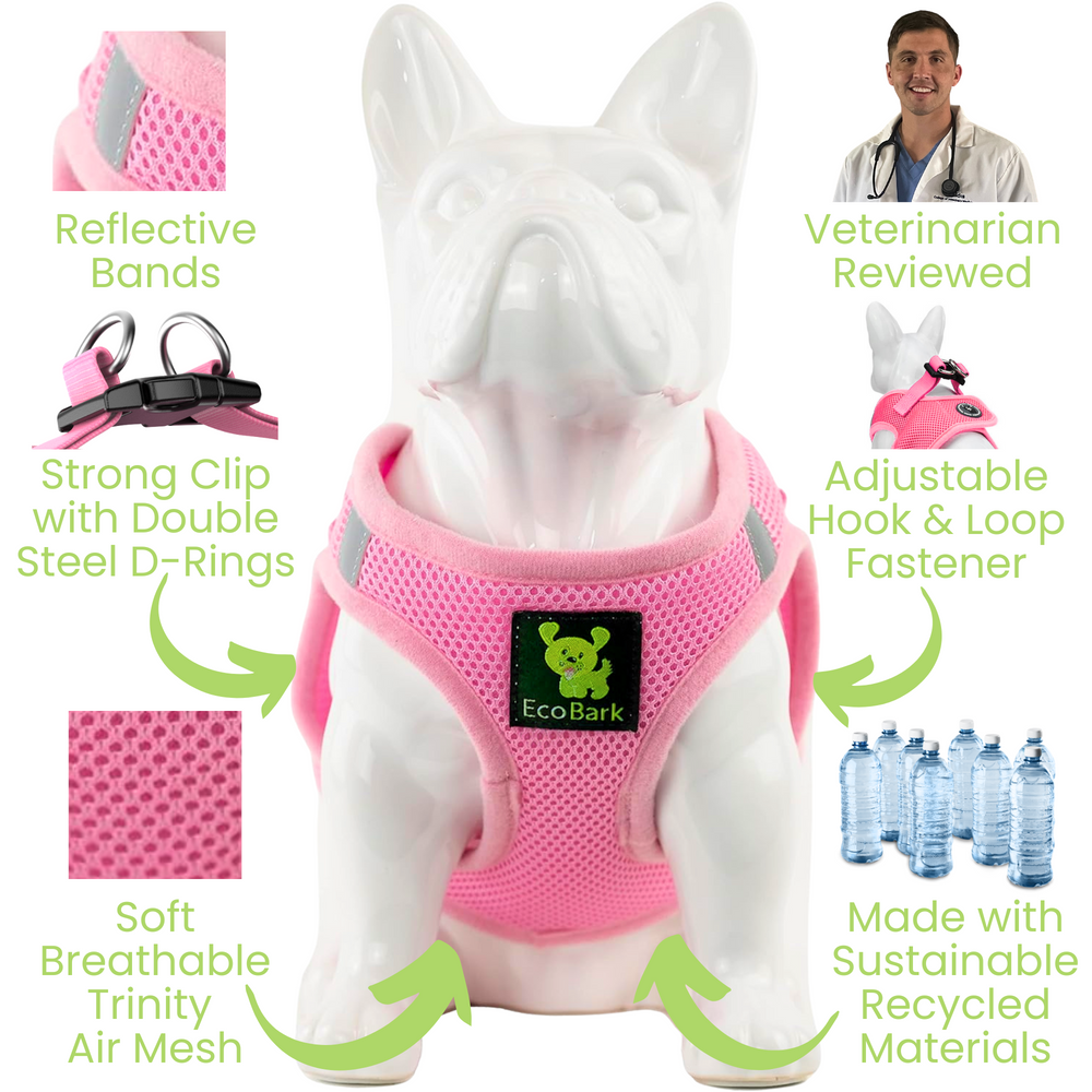 Meet the EcoBark Rapid Fastener Baby Pink Step-In Harness—cute, comfy, and kind to the planet! This harness features our gentle no-choke design that keeps your pup’s throat safe on every walk. The adjustable Velcro strap gives a snug, comfy fit, while the soft, double-padded mesh keeps your dog cool and cozy. Plush piping adds extra comfort for all-day adventures, and reflective shoulder strips make sure your little one shines bright—even after sunset. Made for puppies, teacup, miniature, and small breeds, this harness proves that comfort and safety can look this sweet.